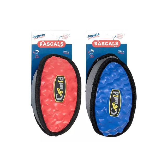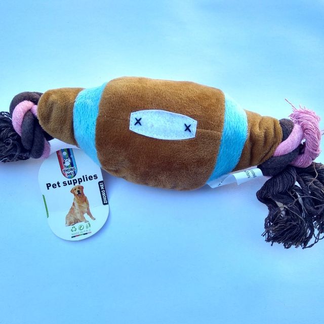 Pelota tipo rugby de peluche con soga. Ideal para peques y medianos de mordida suave a moderada.